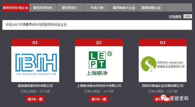 在新材料在线网站实名用户投票阶段,爱彼爱和在122家参选企业之中脱颖而出,始终牢牢占据着票数排行榜前一的位置。至投票结束,爱彼爱和总计获得1955张用户投票。