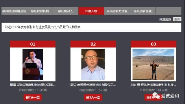 应新材料在线网站邀请,爱彼爱和推荐田雷董事长参加了“新材料产业年度人物”评选。
