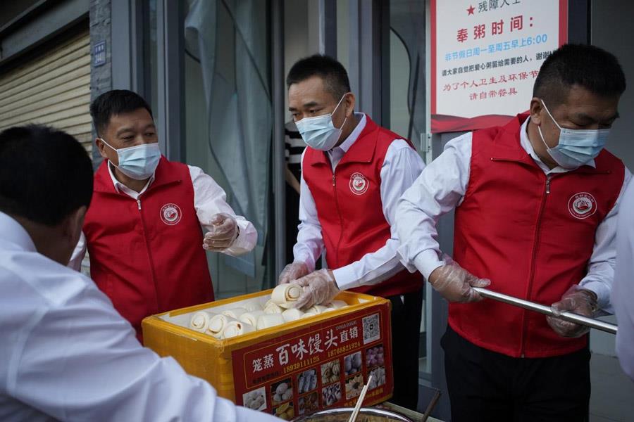爱心粥屋启动后,区领导与爱彼爱和集团领导率先为受助者分发早餐。